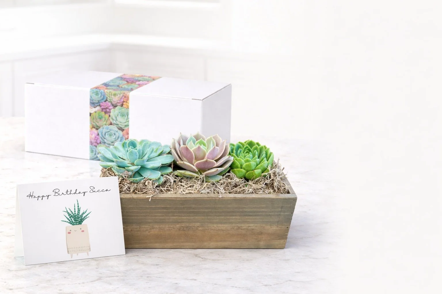 Brighten someone's day with a succulent gift box and a heartfelt greeting card. Whether you're letting them know you're thinking of them or simply sending a gift just because, this thoughtful surprise is sure to bring a smile!