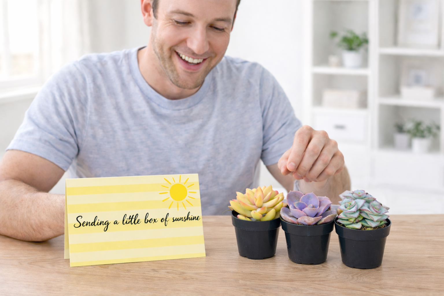 Cheer someone up and send them a live succulent gift paired with light hearted personalized greeting card .